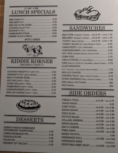 Ive been driving by this place for 56 years so I decided to try it........ overpriced, small portions, pitiful food. The worst restaurant meal in my life. If it wasnt for south bound Florida traffic this place couldnt survive. If south bound Florida travelers want good BBQ stop at any barbecue joint in the Columbus, GA/Phenix City, AL area, theyre all four stars above Dobbs , Yes, the first visit was the last visit.