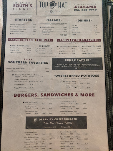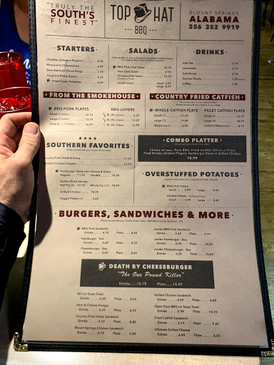 Gross. Paid over $10.00 for four tiny ribs, the sauce on them looked and tasted like they opened a can of tomato soup and dumped it over the top of them. I got fried green tomatos and they would not give me some ranch for them. Fried okra was ok needed to change the fry oil I just had heard so much about top hat and I just was not that impressed. I will try it again and not get ribs maybe something else will be better? My parents also warned me that is was not good so it was not just me saying I did not like it....