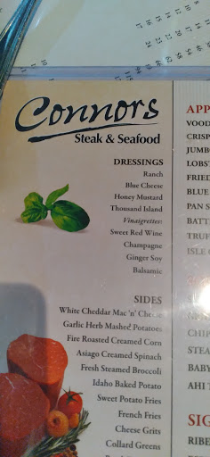 I went to dinner with a group from work on Tuesday night - November 3rd. I was with my boss and colleagues from Nienburg Germany and South Africa. I had the surf and turf - a 6 oz fillet with a half skewer of grilled shrimp on a bed of rice with the house salad and mashed potatoes. I want to say it was one of the best dining experiences I have ever had!! The fillet was so magnificent I dont think I could get a better one in a dream! It was perfectly cooked, perfectly seasoned and cut through with one draw of the knife! I wish I would have taken the time to thank the chef personally! Hopefully he or she sees this review! The shrimp were also excellent as was the salad and mashed potatoes. Let me also say the young lady that waited on us was very personable and full of knowledge about the menu and helped us decide on what to get. Connors is a special place to eat! Thanks for the awesome experience!
