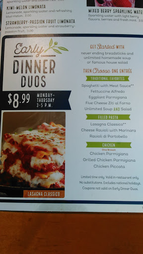 Soup and salad and breadsticks are on point, especially the Zuppa Tuscana (potato/kale/sausage soup), but not much else, which isnt the locations fault. The chain itself needs an actual redefinition on the word "fresh," especially when it comes to the sauces. It feels like you get an awesome variety on the menu, but almost everything is pretty bland, which is a bummer because I love pastas and grilled dishes and would like to commit to something more if it was actually worth it. Thank god for cheese and salt to save most of those things, I guess? Stick with soup and salad until the chain makes a serious overhaul on their recipes. The prices are okay for what you get, and the wait staff are generally very accommodating.