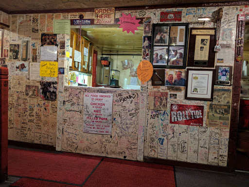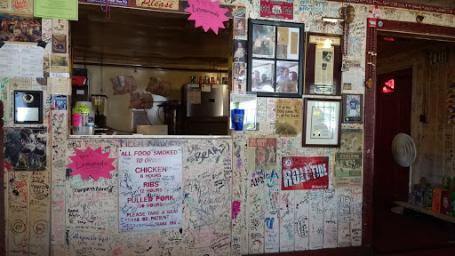 So its a not so great BBQ joint. Well, its an old house turned into a restaurant. Which Im not against, because some of the best BBQ comes from little dives like this. But, upon entering you cant help but notice all the graffiti scrawled on every free space of wall. Which is quaint until you realize that those signatures from 2004 are almost 10 years old now, which means they havent painted (and I highly doubt cleaned) those walls since. Then you notice the well worn carpet and it also has an "icky" look to it. The food: The chicken was dry and overcooked. The ribs were mostly bone though what meat was there tasted ok. Sauces vary from place to place. I wasnt thrilled with either sauce they offer but others may like it. The "Texas Toast" was neither toasted nor buttered, though the bread was "Texas" sized. I ordered the "famous" banana pudding and waited and waited, and finally had to remind them to bring it to me. It was good. Ultimately, I will not recommend this place, nor will I return. There are better BBQ joints that at least have cleaner atmospheres, much less better food.