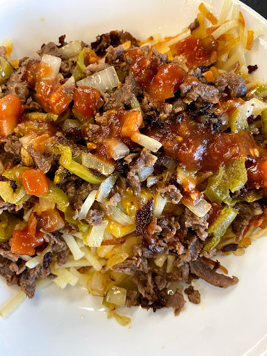 My Texas Bacon Cheese steak melt /w scramble eggs with cheese was Awesome.