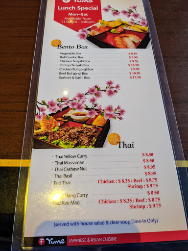 Yume has the best Asian food in the Oxford/Anniston area. Sushi is exceptional -- fresh, creative, delicious, and presented beautifully. Service is attentive, prices are reasonable, and the decor is upscale. Other than sushi, my favorites are the hibachi options (which I often order from the regular dining room), while my husband usually orders Thai dishes. We eat here often and have never had a meal that wasnt exceptional.