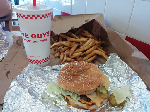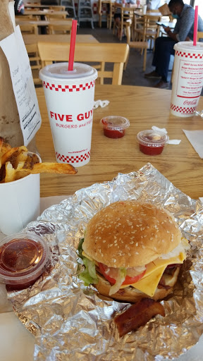 First, let me start by saying that Google has this restaurant categorized wrong - it should be $$, not $ for what it charges for a burger, fries, and a drink. However, its worth every penny. The burgers here are awesome. And the fries are delicious. We usually order two little cheeseburgers, a little fry, and a large drink and we still spend about $16. I love how the toppings are free with the purchase of a burger. I like to stack mine with grilled mushrooms, mayo, ketchup, mustard, and lettuce. Lately, though, Ive switched to ordering a Kosher Dog with mustard and ketchup. Its also very good. The music at all 5 guys Ive been to (in Georgia and Alabama) is usually loud and obnoxious. The atmosphere is stressful as it is usually rock with a harder edge playing over very loud speakers. The choice of music doesnt really bother me, its just the volume level that gets to me. If you visit the restroom, dont expect to stay long unless you want to permanently lose your hearing. They also use the somewhat new Coca-Cola Freestyle machines that lets you choose from about 100 different drink flavors. Whenever I see one of those machines, I know that the Coke will taste terrible. It just isnt the same as a fountain machine dedicated solely to Coke.