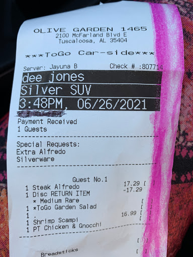 Where do I start.. well first off it took us about 10 minutes to get drinks or any type of waitress/waiter service. Appetizers were good, Although she proceeds to take my fiancés soup and the rest of our breadsticks before we were even done without asking. Entrees were god awful though, Both of our meals were. Waitress came by and asked if I would like meatballs on my pasta for a little extra (didnt ask how many). So when our ticket comes and my fiancé is surprised to find out that each meatball (which the server took joy in picking how many) cost an extra $1.50 a piece. Bottom line is the Olive Garden on McFarland in Tuscaloosa has the worst service Ive ever experienced at Olive Garden.