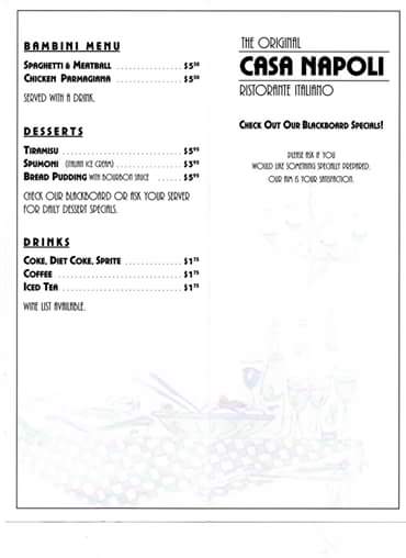 Italian is my favorite food. Ive eaten at Casa Napoli twice, I didnt enjoy it either time. This past weekend I had Tour of Napoli. The chicken parmesan, fettuccine alfredo and lasagna were all very dry and fairly tasteless. My salad, both times, was room temp and the bleu cheese dressing tasted like bottled dressing that had been around too long. Three fourths of the salad was removed by the waiter and at least half my entree was as well. This should have been a clue but the waiter, who did a GREAT job of waiting our table, asked me nothing about how the food was. My husband and I ordered the same thing and he felt as I did about it, he didnt finish his meal either. Our friends seemed to enjoy their dinner. Ill stick to Carrabbbas.