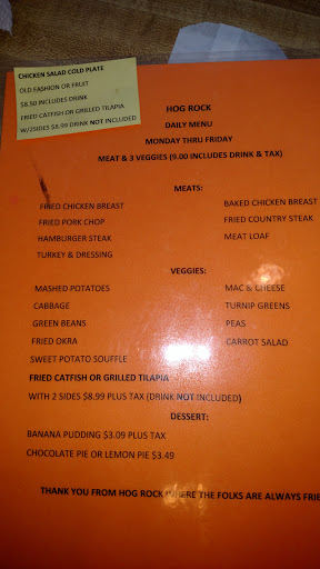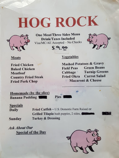 Southern fried chicken nuggets, homemade macaroni and cheese, hand breaded okra, and the best banana pudding are my favorites at Hog Rock. They offer a fantastic menu for lunch and youre in and out quickly. I love the service and notice that they dont have much turnover--must be a good place to work.