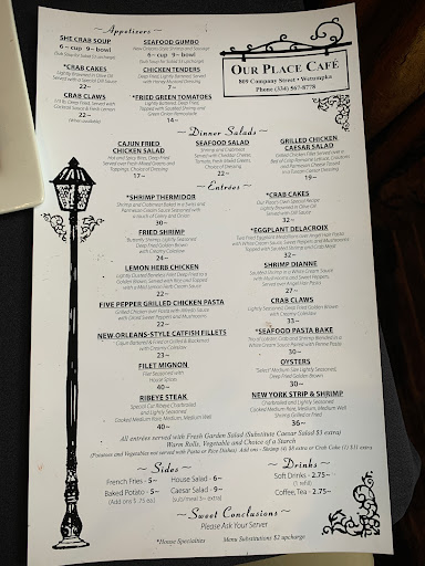 Just celebrated our 45th wedding anniversary at Our Place and had a wonderful dinner. The Eggplant Delacroix was superb, as was the Ribeye Steak. Excellent service and ambience. Couldnt have been better!