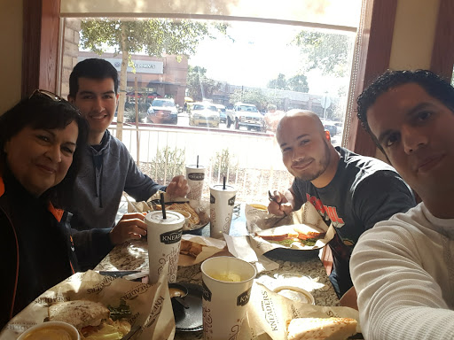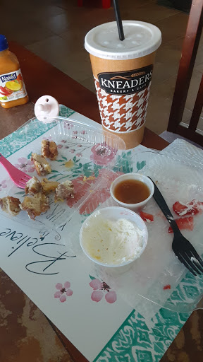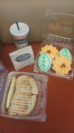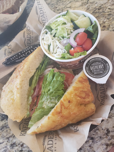 For breakfast Kneaders offers all you can eat (dine in) French Toast or Pancakes. I am not a French toast fan but I love theirs!! It is made with their delicious fresh breads and is thick cut with lots of cinnamon in the batter. The French toast is served with sides of caramel syrup and fresh whipped cream and strawberries. When you receive your French toast the plate comes with two generous sized pieces and then all you need to do is step up to the cashiers to ask for a refill when ready and someone will deliver an additional piece to you for each request. If dining for lunch or dinner get yourself something with turkey. They roast whole turkeys in store everyday and you can tell. My favorite dish is the sunflower turkey salad without mushrooms and adding cucumber. Be sure to get their loyalty card it tracks all your purchases and you get 5% of each purchase loaded back to the card. Lunch hour is busy at this location so consider ordering online! You can pickup in drive thru line as long as you arrive after the time your food is scheduled to be complete! :)