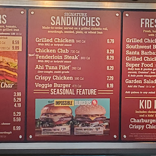 Interesting place. Take a fast "hamburger joint" that is a bit upscale (mostly like the ones from Cali- you know who they are- the one with an all fresh-faced 16-year-old staff or the one that sells sloppy "man food" burgers held by super models) and add a dark earthtones, open-pub feel. (Its not bar.) Add a few exotic sandwiches like grilled chicken, tri-tip or tuna + unusual sides such sandwich-shop things like tiny chili peppers and pepperoncini ...and you get this place. Meats are flame-grilled by cooks and not running through a smoke-flavoring machine like the King. More inexpensive than we expected but still ran about $9 each. Food is good enough. Theres a short kids menu. Veggie burgers and salads. Sweet potato fries, fried green beans which people seem to buy those alone for some munchy to-go goodness. Just be aware the place is a tight fit when its busy. Your group of more than four might get split up.