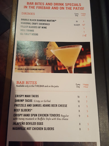 I absolutely love Firebirds. The atmosphere amazing. Their food is better!! Their steaks are phenomenal, salmon takes on the best flavor from the woodfired grill. If you havent tried the spinach salad-youre missing out. The waitresses are very nice and attentive. This would have been a 5 star rating, however, we went there last night to have a desert pear martini (one of my favs) its no longer on the menu, but they made it for us anyway. It was horrible. To my surprise it was purple in color instead of an off white and it tasted very floral. The manager apologized, no biggie I thought. He said they have new bartenders and they can get those drinks for us but we should pick out a different drink. So we did. We ordered a raspberry pear margarita-that was worse than the desert pear. After two wrong drinks we were not going to send it back to the bar. We didnt complain instead we paid for our drinks and food. I was very disappointed that they were not able to get pur drinks right. But if youre looking for a great place for food this is your place (just dont eat the crab cakes or meatloaf). You should have a taste of Firebirds and make your decision on how many stars it deserves xoxoxo