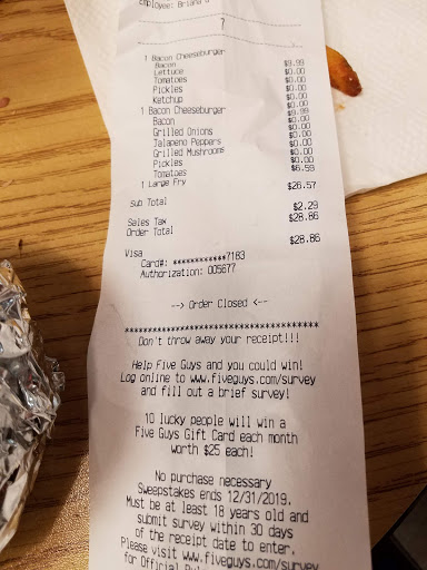 Im loving the hate reviews towards 5 guys in general. If you cant afford it, go to McDonalds down the street. Its as plain and simple as that. Lol. Ever since I had 5 guys for the first time in this state, I loved it. It is on the pricey side but the burgers are hot and juicy. The fries I can care less about since I rarely get the fries, but they are pretty good. And they give a lot too. IF they had specials every so often, Id be there all the time. Other than that, I may have 5 guys once every 3 months or so.