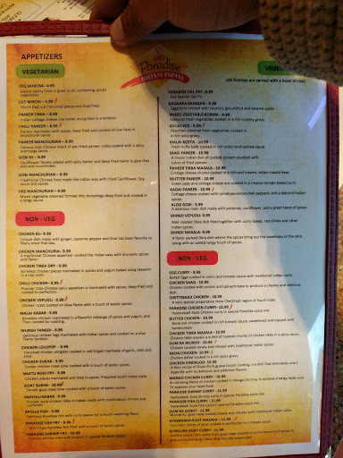 Awesome taste and quality.... Definitely feel the authentic Indian taste.. Paradise specials and goat dum briyani are my favorites.. They are maintaining spice level for kids too.. Happy to see good restaurant near to my home..
