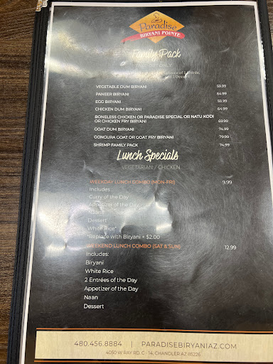 This is by far the best place in Arizona for Indian food; especially for Biryani and Entrée. Im a foodie myself and visited most of the restaurants in Arizona. The Biryani here is authentic and prepared afresh everyday unlike most restaurants that serve 3 days old Biryani. I visit this place at least once every week and love their well balanced lunch specials. Paradise Special Dum Biryani, Gobi Manchurian, Murgh Tangdi, Chicken Saag, Paneer Tikka Masala, Qubani Ka Meetha are some of my other favorites. I love their environment and the staff is very courteous. However, there is little wait time because of popular demand and I dont hold it against them. Its just a suggestion to the owner to look into.