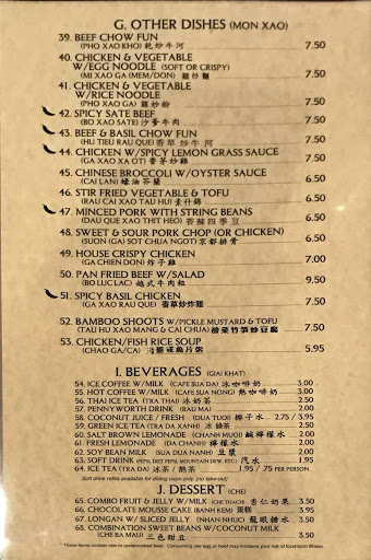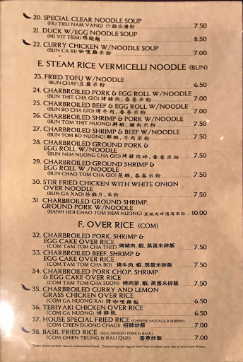Ive been to this place hundreds times. Love their items #14 Vegi noodle soup and #32 Lemon grass chicken dishes. You can substitute the noodle with clear noodle for just extra $1, if you dont like their traditional white rice noodle. This place is always crowded, so avoid to come between 5:00pm and 7:00pm. The price and the taste is what makes it my favorite Asian restaurant.
