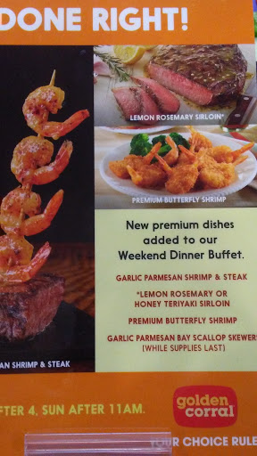 We thoroughly enjoy this location of Golden Corral. The food has always been fresh and the temperature just perfect. This location has recently acquired a smoker and has cooked some outstanding smoked meats that one has got to taste! The smoked, pulled pork is absolutely delicious. The pulled pork is on the buffet plain with three different bottles of BBQ sauce for you to decide which one you want to put on your meat. Ask your waiter for some of their homemade buns, get some pork BBQ and coleslaw and make the most delicious sandwich along with some baked beans. The smoked brisket will melt in your mouth. I had a sliver of fat that was still on there last night, it melted in my mouth like liquid smoke..... and when they serve the prime rib! Oh my, you cant go wrong! There is just so many good foods and everything is fresh there at the Golden Corral. As you eat, you can watch as the fruits and veggies are being cut. Watch as cakes are decorated, sugar spun into cotton candy, dough into rolls, and so much more. The price has gone up with the minimum wage increase. Along with the price increase, Golden Corral has also upped the quality and items they are offering you for the buffet. I dont think you can eat this good anywhere else in the valley for this price. Linda, the store manager, is a fair a decent woman who wants all of her customers to be happy. Please leave a tip even though this is a buffet because you do get service here from the wait staff. They bring you your drinks, rolls and anything else you request. Senior Early Bird price from 2-4pm M-F drink included; Senior Discount Saturday all day, buy your own drink, Senior Discount Sunday about $1 drinks included only for breakfast. Handicapped parking with slopes on sidewalks to access restaurant. Handicapped accessible restrooms.