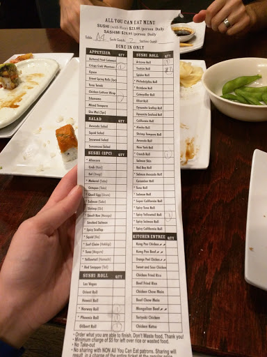 let me preface this with the fact that I have been a loyal customer for almost 6 years... until now I had a party of 12 arrive at 6pm and the restaurant was fairly empty. it took over 5 minutes for a server to greet us and another almost 5 minutes to receive our water. There were no napkins, plates, or soy sauce dishes on the table. When another member of my party got up and asked the manager for some plates and napkins (due to the server not being around), she told him "yes yes yes we will get it, now go sit down" I dont think anything needs to be said about the rudeness of that above quote. Myself and a buddy both got the all you can eat. After ordering the sushi, it took approximately 35 minutes to get the first round. The server took the paper for us to write our next round down and it took almost 20 minutes to track down the paper. While trying to write the second order down, the manager came over in a hurry and demanded to see our paper after telling us we had a rainbow roll (we told her we didnt order that). She continued to demand our paper until we handed it to her. She then hurried away. We handed the paper to the server with our second order and approximately 45 minutes after that, myself and my buddy had to ask what the status was. The server said he would check on it. Approximately 20 minutes after that, another manager brought out my buddies two rolls and none of mine. The server asked us if everything was good. I informed him that I was missing my sushi rolls and gyoza and my buddies calamari. They brought all of the checks out at this time (weird since I didnt even have all of my food yet, same for my buddy) The server stated "it will be a very long time for the gyoza". I was shocked and asked why. He stated that the orders were very backed up. I told him forget it. We finished our food and I wrote on the check that it was the worst service Ive had in 6 years... its a shame because it used to be the best place to go. now the prices are hiked up and the service is way below par. do yourself a favor and find another place. hope this was helpful!