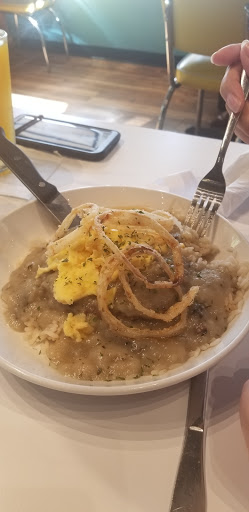 Eating at Over Easy was severely disappointing. The food ordered between myself and my friend consisted of the carmelized banana and pecan brioche french toast and the chicken fried steak meal. Amazingly, the french toast meal tasted like absolutely nothing. I tried sopping the burnt french toast in the minimally drizzled caramel but found no respite from the aforementioned blandness. How could a caramel sauce taste like nothing? Why were there less than 10 thin slices of banana on the french toast? Why where these banana slices halfway to dehydrated banana chips? It was poor at best. My friends chicken fried steak was a mix of substances that resembled hashbrowns, eggs, gravy, and chicken fried steak, but again tasted like the blandest food he had ever had. They dont offer combinations of pancakes and eggs or anything like that, but they will trade your toast and potatoes out for A SINGLE pancake. Wow. Youll take away half of my meal and give me ONE pancake? Amazing. Anyways, after all of my dramatic writing you should take away this: tasteless to bad tasting food, overpriced, and ridiculously disappointing.