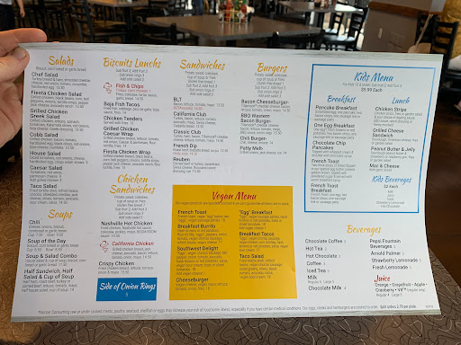 Service was excellent and friendly. This is my second time here. This is not a great place if youre trying to eat healthy. I had the veggie head omelet with biscuits. I subbed fresh fruit for the potatoes. Also, coffee. The coffee mugs are huge - easily twice the size of most sit down restaurants. Theres the usual half and half and the flavored less real stuff. The omelet was good .... But not great. The biscuits and strawberry jam were better, closer to great, but not quite there. The fresh fruit was okay .... I love fresh fruit, but found it hohum. Not worth the extra $1.99, although certainly the healthiest choice. My friends ordered French toast and eggs Benedict - they were quite taken with their food. Nice ambience were were there latish Saturday 12:45, I think. Not too busy and relatively quiet. I will probably be back with friends, but probably not on my own. Id rather not have to face too many foods Id be better off without.