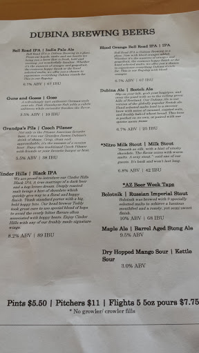 Very disappointed in Dubina. Their website stated the Maple beer was on tap so we drove from Goodyear to 67th Ave in Glendale to get it as its only seasonal, only to find that it was gone along with the blueberry wheat which were the only 2 my wife wanted to try. The waitress could only say... you need to call ahead next time. They had in pen on the bottom of the menu the blood orange IPA was back... so it seems like they have a hard time keeping their beers on tap.