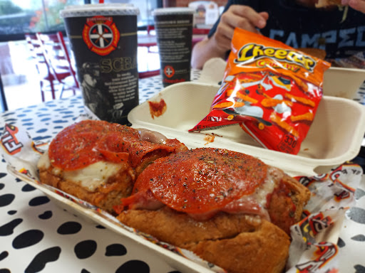 Although the man behind the counter was super friendly to everyone, he shoved food in his mouth with gloves on, two feet from my sandwich, and then stepped up and started finishing my sandwich, all the while, chatting and laughing with food in his mouth, over my sandwich, with mouth gloves on. This is my least favorite Firehouse Subs location by far. Servsafe people.
