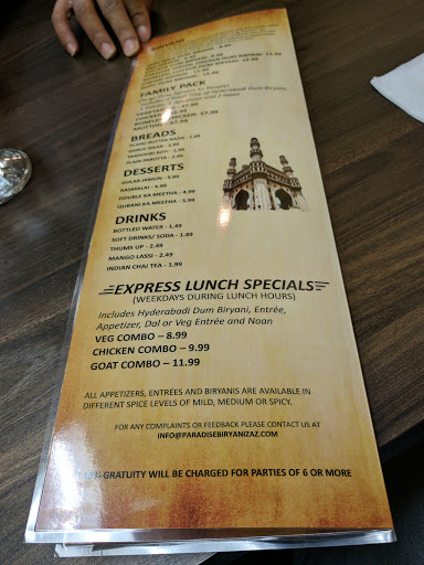 biryani was stale and had no pieces, it looked more like a bagaara rice rather than biryani. The Dhum biryani had no masala and was v dry. Paradise needs to improve their biryani or its hard to compete in arizona before pastries n chaat which have marvellous chicken and goat biryanis.Please paradise either change your chef or change your menu. v bad experience. As already described the biryani was stale and had no masala or the Dhum. Please follow Paradise biryani New Jersey receipe in order to get customers back.