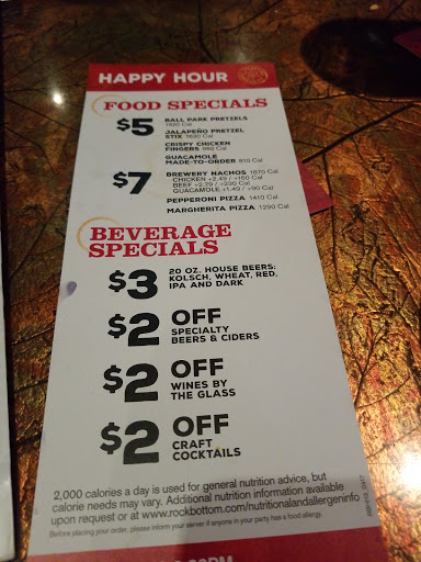 I took my wife to Rock Bottom for our wedding anniversary. Neither of us had eaten at this restaurant chain before, so we thought we would give it a try. When we first walked into the dining area, we both were impressed with decor. Unfortunately, that was about the only good part of our dining experience. Our waiter would disappear for 10 to 15 minutes at a time. My wife had the steak & fries, while I had the bacon and bbq burger. The steak was dry and arrived at our table cold. The asparagus side dish was wilted and appeared to be dried out and stringy. It too was cold. The burger was okay, but nothing spectacular. I tried their micro brewed beers and was disappointed with their offerings. Each beer sample either had bad or weak flavor. Micro brewed beers seem to be hit or miss. Rock Bottoms beer is definitely a miss. We wont be coming back.