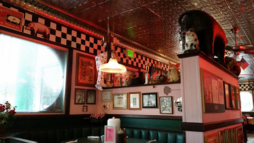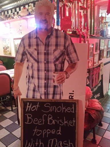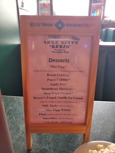My husband and I rarely get a day off together and love BBQ. So, after reading about "Thee Pitts Again" in Peace, Love & BBQ and finding out that the joint appear on "Diners, Drive-Ins & Dives," we figured it would be amazing. At first glace, the exterior was pretty neat with the silver - as it was a 5 & Diner in its prior life. Once we walked it, it transpired to a pink and green nightmare dressed up with tons of creep pig decor that reminds you of an old farmer ladys kitchen & mis-matched table cloths. The service was friendly, but very slow as there were only a young girl and a new guy working. My husband order the full rack of ribs, beans and salad, I order the 3 meat combo (hubby wanted to try some of my brisket) with pulled pork, pulled turkey and brisket. Sides were mashed potatoes and salad. An appetizer of fried mushrooms was also ordered. The presentation was nice. The ribs were black (which is ok due to the dry rub) but tasted "old and well over-cooked." Beans were mediocre. My pulled pork had a good taste and I was please with it. The turkey was kind of bland and maybe needed some of the mesquite smoke that was used for the ribs. The brisket was again ok and had the old taste and was also over-cooked like the ribs. The potatoes I suspect were last nights left over baked potatoes that were mashed down and seasoned, top with little gravy. I think this b/c it smelled of a baked potato, we ate about 1pm and baked potatoes are not available until after 5pm. The salads were as too be expected. Cornbread was very dry and crumbled to pieces. The fried mushrooms were great. The batter was excellent. Im glad we ordered them since everything else was disappointing...it kind remedied the experience a little. We walked out spending $55. An amount I would have much rather spent at Lucilles BBQ in Tempe, AZ or bought the meat ourselves and BBQd it like we normally do. No hard feelings, well chalk this up to an experience. The owner has trophies from numerous competitions that he has placed in. I highly doubt he was back at the pit preparing anything today. If he won trophies for competitions, appeared in a book and on DDDs with Guy Fieri, this gives hope to the little people. This place may have been good once, but after the fame, its definitely lacking. Maybe it was the "Dive" segment for "Diners, Drive-Ins & Dives." DISCLAIMER: I write reviews for all place I deem worthy - Great experiences or bad. We are not food critics, but this experience showed us what not to do when we open our BBQ.