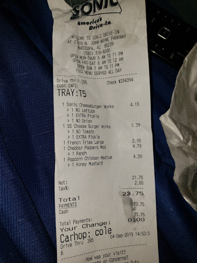 Phone to call in an order is totally static, you cant hear them and they cant hear you. They gave me the wrong order twice when I came here and over charged me on both times. And than they forget to give you the change when they say "theyll be right back" with the change... and on another note, my boyfriend and i bother found smal hairs at the bottom of our coney hotdog food trays. (It better be an eyelash hair) thats gross and means that they should wear hairnets! (Which none of the employees have on FYI) I am not pleased with this service at Sonic in Maricopa!