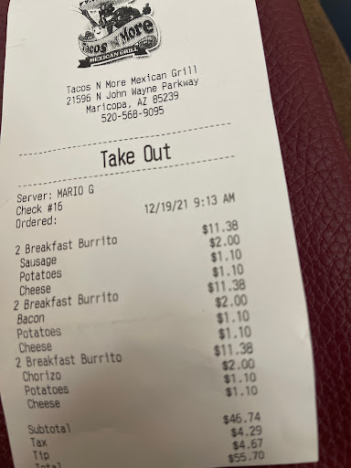 This place is amazing. A true hidden gem in Maricopa. The restaurant is clean, the food is always fresh, and the staff are very friendly. Their chorizo breakfast burritos (or any of their breakfast burritos) are beyond good. Everything is made to order from scratch, so its not fast food. Ill say right now it is the best breakfast burrito in Maricopa.