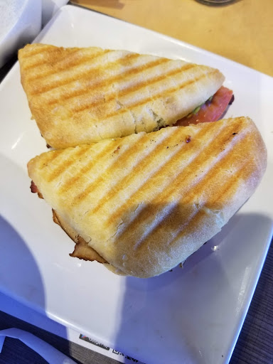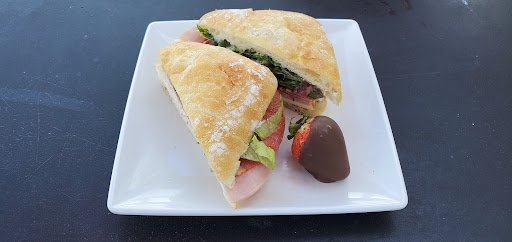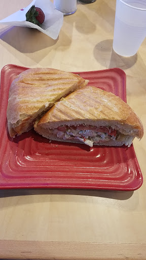 Not very impressed at all. The premise is good, but the food is very average. Went there around noon-ish with hubby and Mom. We each ordered a sandwich. Nothing special at all about the sandwiches. My panini was very small. Their sandwiches came on rolls. The cold cuts were thick but tasted like you got them at the grocery deli section. Nothing special. I was contemplating soup and tasted their mushroom soup and lobster bisque. Both were watery and tasteless. The lobster bisque had a little spice kick to it which I didnt care for so I passed on the soup. The place was VERY noisy and we couldnt hear the people behind the counter. Also, the menus have very tiny print so if youre elderly or have vision problems good luck. The only nice thing was that each sandwich came with a little chocolate dipped strawberry, which was a nice touch. We were actually all still hungry after lunch so we ordered a piece of chocolate mousse cake which looked delicious. Mom & I split it and were big chocolate fanatics. This cake had absolutely no taste to it whatsoever. None. Not sweet, not anything. Just simply no taste. We both agreed on that. I dont think well be back. Its a great premise but the food is average to below average in taste.