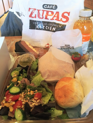 They threw away my food when I wasnt done eating it and didnt even have the courtesy to offer me another meal or a refund! I have been to Zupas often and enjoy it, but I was just shocked at my experience today. I was eating lunch and got up to refill my drink. I left half of my sandwhich, about half of the soup, most of the roll, and the entire strawberry on my plate. No one else was at the soda fountain so it took less than 30 seconds, or so, to refill my drink. When I returned to my table all of my food was gone and there was was an employee wiping it down with a rag. Im glad they wipe tables down, but they really need to let people finish eating before they throw it away. The employee apologized and said he was so sorry but didnt offer to replace my food. Neither did he offer a refund. Nothing was done but an apology for through in away 60% of my uneaten meal. I appreciate the apology but that doesnt put delicious food in my belly. I left. I guess I wont be going back either after that.