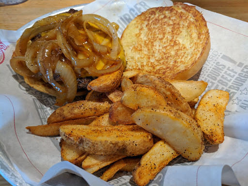 Yes, its a chain. However, they have a good product- perfectly cooked burgers on fresh ingredients. I have the 1/2 Lb Works burger and it slays my hunger every time. They customize the burger as you wish. The adds are good too- steak fries , fresh veggies for toppings etc. It can be a bit pricey, but worth it compared to lower quality burger stops. Their shakes are also good, so try then if you have saved up some calories. This location has good staff that is polite and patient. Appreciate that.