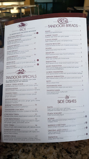 Excellent place for lunch buffett, with atleast four kinds of each; meat dishes, vegetable dishes, sweets and fruit salad cucumber raita, tamirind apetiser, mango Achars besides a big clean dining room to enjoy hot tea, mango lassi, cold water and beer drinks etc. to buy. Good selection on the menu. Services are excellent, all people are courteous.