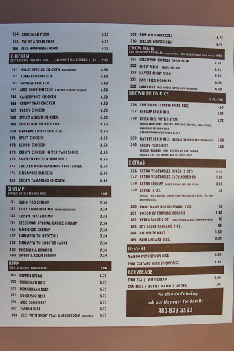we had been ordering from another place but never really cared for it, but then tried Szechuan express after receiving a flyer on our door and have been really happy with it. Great crab rangoons and chow main. We have also had the orange chicken and cashew chicken both have been super yummy! Staff is very friendly!