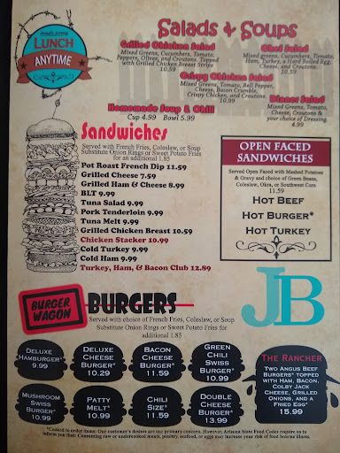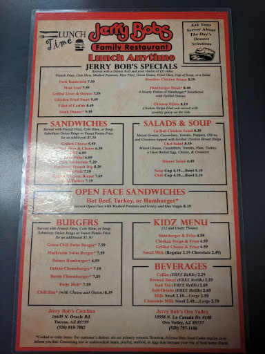 Undesirable & Indescribable! Upon entering we asked for a high chair and After seating ourselves, we waited waited more than 5 min to receive one. Although we had 3 staff members walk past us while we sat waiting. When expressing to the "waitress" that nothing on the menu was 1 yr old friendly (at which point our "Reg Jerry Bobs" would have offered for an alternative) no alternatives were offered. Then after clearly choosing a cold item for the baby we had to wait almost 15 min (with a reminder thrown in) for the "Cinnamon Roll" to arrive. When it was set down I almost died @ the 1/2 inch layer of frosting on it (seriously, as if I would feed my 1 yr old that) so as I scrapped it all off I realized it had been heated (which was now to hot for a baby) + we had not asked for it to be heated, for a reason. Then once we FINALLY were served our "food" it was VERY DISAPPOINTING even to look at. My Turkey sandwich (which I did not ask to have toasted) looked charred, and had almost no turkey on + it did not come with any mayo or side of. The other plate that had been ordered was Meatloaf... Holy 4 day old keeping it warm under a heating lamp, sad looking piece of meat. But thats not all... the mashed potatoes were grey in color, dry and looked days old as well. Then the gravy which had been specifically told to us, would come on the food... Of course did Not! It was brought in a side dish. And the veggies that were expected (just simple green beans) arrived with an entire family of tomatoes living in them...ewww!! Our "waitress" asked how everything was, and when I was 100% honest about the indescribable disappointment... she said "Oh Im sorry" and walked away. No compensation offered, No Mgr to speak with. We can Honestly say... we Will NOT EVER be going back!! We will stick with our Regular, Family Friendly, Delicious, Not Over Priced Jerry Bobs in NW Tucson!!