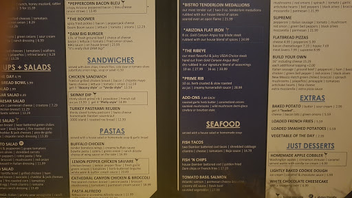 This restaurant really surprised us in a nice way, the ratings (3.3) do not reflect reality. We spend few days in Page and first night we were looking for place to have dinner. Unfortunately not many great options, so we had a hard time deciding, but decided to stop by here. The place is big and the decor is all over the place, so our hopes were not high. We had Cobb salads, they are a normal size, not too big, but not small either. The house made dressing on the Cobb is amazing...I tasted it before I decided to have my salad tossed and I loved it. Me and my husband split a New York stake which was cooked to perfection and absolute delicious. The kids decided to split pizza, each customized their half. The dough is house-made, it is a normal crust style pizza. Usually the dough turns soggy, but we were really presently surprised - cooked to perfection and delicious. There was plenty of cheese and other toppings, the pizza was better than most specialized pizza places and we know pizza... The desert...ohhh that dessert....simply amazing! The kids split the cookie dough desert which comes with a hot cookie toped with vanilla ice-cream and whipped cream. I am staying away from carbs and sugar, well poor kids, I found my self eating half of the desert. Next day we came again for lunch, we tried the 1 pound burger, potato skins and again we had the same desert, but this time we ordered two...got to enjoy your vacation, right?:-) This is an excellent restaurant with amazing food and next time we are in Page we will be eating here again.