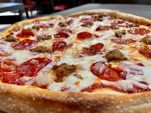 Stopped by with my son for lunch. Pizza is more like a New York style thin crust. Not too crispy, and large slices that youve got to fold to eat. Pizza was done well, not soggy. Sizeable dining room. And they have a bar with several beers on tap. Theyve got lunch specials. And drink specials that go all day as well. They do delivery, and you can order online as well. This place is going to be hard to see from the road soon because theres a new building being built between them and the road.