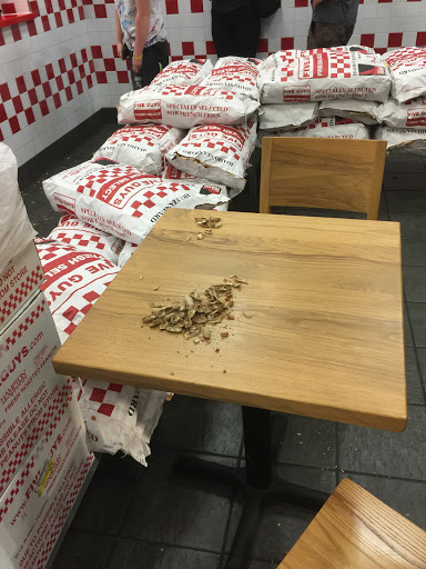 11/04/16 I came here tonight to grab my usual Five Guys burger. When I walked in there was a guy ordering and I was waiting when I noticed shells on the floor. A lot of them. When it was my turn to order I let my cashier know (Amaya) that there were shells on the floor since I assumed they were unaware. Her response was oh we give peanuts away here. So what was your order? I was a bit shocked. So I asked her name then to speak to a manager. A guy named (Kaylyn) came up to the counter and I repeated all of this to him. I also added that when I said there were nuts on the floor (Amaya) acted as if she didnt care. He said sorry about that we will take care of it. We have been busy. I ordered a burger after this. My order was totaled at 8:28pm and I left at 9pm. When I walked out the door no employee had even walked over to where the nuts were and customers were lined up waiting. If someone doesnt care about filth and lousy customer service then go here....otherwise go to another location! Ps this was my first time at this location and I love Five Guys. Pictures attached!