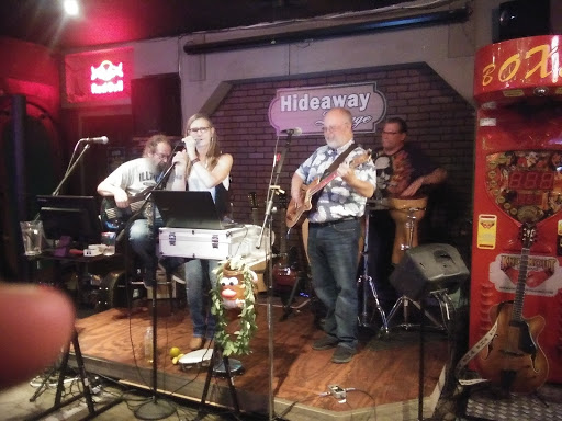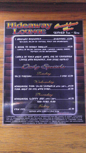 DEFINITELY A PLACE YOU WANT TO STAY AWAY FROM. WE SAW EILEEN DROP SOMEONES FOOD ON THE FLOOR AND PICK IT UP AND PUT IT BACK ON THE PLATE. WE DIDNT ORDER FOOD AFTER THAT. I HAD TO GO TO THE BATHROOM BEFORE WE LEFT AND SHE WAS IN THERE. SHE CAME OUT OF TOILET AND DIDNT WASH HER HANDS. WE SAW SOME PEOPLE AT ANOTHER PLACE AND THEY SAID THEY GOT FOOD POISONING IN THE HIDEAWAY. LOUNGE.