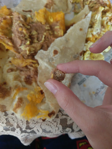 I asked for a Bean and cheese burrito + egg. The egg tastes like it was cooked in a pan left full of old grease all night. So I took the egg out (very hungry still) and tried to continue , but bit something cartilage-like (IM VEGATARIAN). Then to find about a spoon of beans and a slice of cheese half melted in the middle. I am appalled.