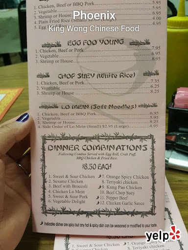 I rated them a 2 because I wouldnt order from them again. My experience was more "not good" than "bad." My order: Hot and Sour Soup, Chicken Fried Rice, Kung Pao Chicken, and WonTon Chips; it came with 2 free egg rolls. Egg Rolls: I think they used the thickest, toughest leaves of the cabbage for these egg rolls; every bite was like biting into the part of the cabbage leaves that nobody wants. Chicken Fried Rice: I tend to measure Chinese restaurants by the quality of this dish and each time I try a new place, its one of the things I always order. King Wong had what was probably the worst I have ever eaten. The chicken was dry and tough and had no flavor....and I dont know how else to say it but it was like it was old. Kung Pao Chicken: I think they used the same chicken as in the fried rice, dry, tough, and old. Aside from that, it was fine. Thats the best thing I can say about it. WonTon Chips: I was actually quite tickled to see these on the menu because theyre like Chinese crack to me and I rarely see them offered. And even though I chowed on them like the had crack inside them, I was not oblivious to the fact that about half of them were considerably darker than the rest, suggesting that they had been fried, left out for a long time, and then fried again. Hot and Sour Soup: The broth had that "kick" that I enjoy when eating this dish. Not much else to say about it. I dont want to discourage people from going here; the lady on the phone who took my order was very nice and conscientious and made absolutely certain that she had my order right, and they did deliver the food faster than the 45 minutes they had suggested would be required. For me, however, the bottom line with a restaurant is the food, and while i really wanted to be happy with it, every bite was a mouthful of disappointment.