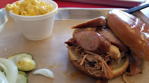 I pulled in late for lunch, about 1:30, and was a little concerned because it seemed pretty quiet. I went in, was warmly welcomed, and placed my order. I tried the sliced brisket, pulled pork, coleslaw, and beans. The platter also had a little corn muffin. The brisket was spot on. - moist, smokey, flavorful. The pulled pork had great flavor and texture. I doctored up the pork with a sample of the spicy and sweet sauces. Both nicely complemented the pork although I preferred the spicy sauce. The slaw was creamy mayo based savory, not sweet. Probably my only misgiving about the meal were the beans. The beans were a bit flat. Need some salt an/or vinegar. I dumped some of the spicy BBQ sauce on them and they were perfect. I thought about knocking the rating down to 4 stars because of the beans but that seems pretty weak-assed to know down a bbq place because of the sides. So 5 stars it is. I was disappointed that they were out of cobbler. I believe cobbler is the perfect finish to bbq meals so I will be back to get the full experience.