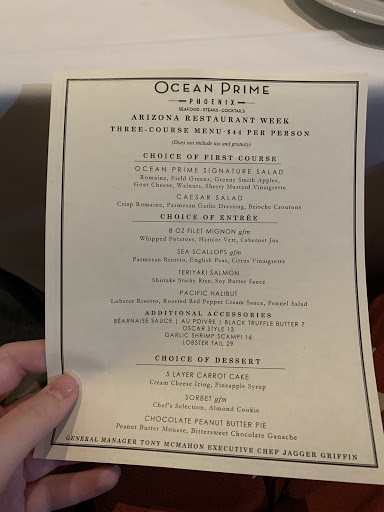 First time at Ocean Prime and the one thing that turned me off was the lobster tail I ordered it was not fresh. The steak I ordered with the tail was excellent. The service was great. Will give it a second go next time in Phoenix because the place seems to be better than the one bad tail.