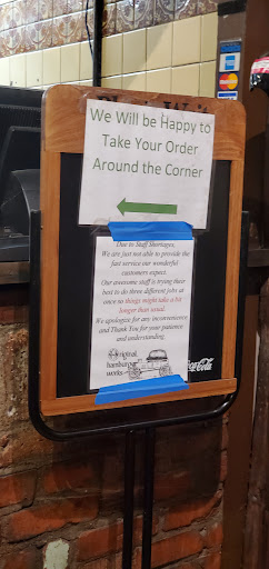 We love hamburger works! Its our favorite neighborhood bar and grill. The hamburgers are the best in town and the bar staff are always friendly. The decor may be old but some of us are old too. It feels homey and cozy. I love the booth seating in the bar and the free popcorn and peanuts! The big salad bar rocks too. The only negative I would say is no dessert selection. All they have big cookies...not to good either. They should buy spunkmeyer cookies.