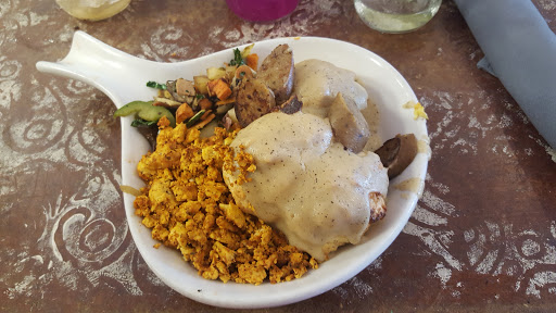The food and the space here are excellent. The service on the other hand, so-so. In terms of space: You have the choice of dining outside on the spacious patio, inside to the left in the main seating area, or to the right amongst the mini-market wares, so a nice variety. The mini-market has foodstuffs, household, & body care products by almost exclusively local artisanal producers, ranging from Ramona Farms tepary beans to Simply by Natures probiotic deodorant (both of which, were big fans of). For food, youve got a massive range of vegan and vegetarian dishes, all organic (or rather, 98% plus), much of it local, and from the sampling we tried, all of it delicious - even surprisingly so when you consider how often people slack on vegan cuisine, simply relying on its being healthier or cleaner as an excuse to lack in flavour. Stylistically, its primarily classic comfort food (very kid-friendly). Some of our favorites include the blueberry lavender smoothie, gila monster nachos, and the buffalo chicken wrap (even though its oddly reminiscent of teriyaki). The service isnt terrible, but its not great either. Though everyone there is perfectly friendly and chill, theyre also slow and often inattentive, busy or not.