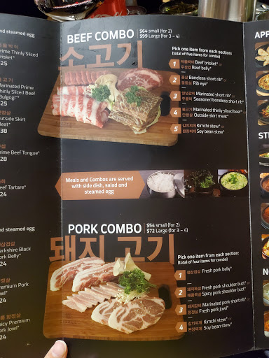Great food good service. But $$$s ..... Party of 3 so we got the combo $99, lots of meat. We added a spicy pork $$. So with all the appetizers and added 3 steamed rice we had plenty of food. Server was good about grilling meat the way we wanted it and she helped with questions on dipping sauces. All in all good birthday present!!