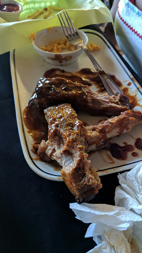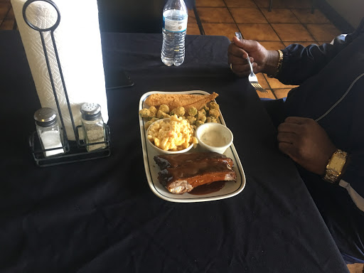 Hmm ordered from this place twice, got there and the place looks like a dive inside and out, but put that behind me as I was curious about the food. Order a half chicken and rack of ribs, it was okay, small portions for the price. 2nd time needed ribs for party, ordered them over phone and the guy who answed was curt as though I was bothering him. Went and picked up ribs and young black lady pulls out her glock 9mm from counter to joke around with friened or boyfriend? Idk? But totally unprofessional in from of me. I ordered 5 racks of baby back ribs, they were dry as though they were cooked a day before.
