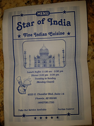 I used to have more of an affinity for Star of India, but apparently my tastes have changed since becoming vegetarian. I recently went there for the buffet and was a little disappointed with the food. The service is always great and very personal, but sometimes the buffet can be lacking. Its not that the food is bad per se, but the same variety of dishes are always served. Of the six main dishes, four are vegetarian. I know at least two of those have paneer cheese, so vegans might want to call ahead first and check. I do not believe that the naan is vegan either. At any rate, last time I went, the saag was somewhat flavorless and the gulab jamun were dry, even though we arrived when the buffet first opened. This is still a restaurant I will go to whenever I am in Ahwatukee and want a comfortable, enjoyable experience. Warning to vegetarians: the server will bring tandoori chicken to your table at the start of your meal unless you ask that it not be brought.