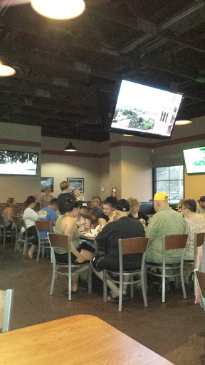 The restaurant was very busy but we were seated within the stated 15 minutes or so. We ordered the Chicken Parm sandwich and the Fish with Shrimp platter. Our server Dan was fairly new but attentive and friendly. The fish was fried too long and was pretty awful. The fries are the worst ever---cant stand those coated fries. The slaw was good and the potato skin appetizer was good. The chicken parm sandwich was very dry and when asked for additional marinara sauce we were surprised to see an additional .59 added for the little tiny cup of sauce. Also paid .59 each for two sides of ranch but only received one as I didnt eat my fries. Good wait service but horrible food---cost over $40 with the tip! Wont go back.